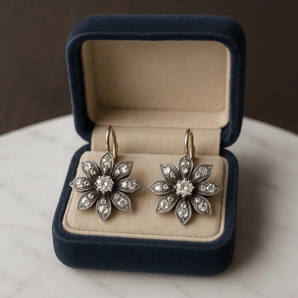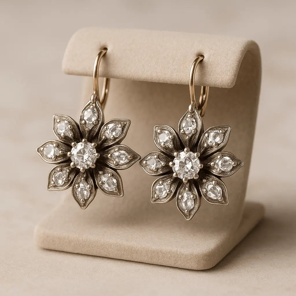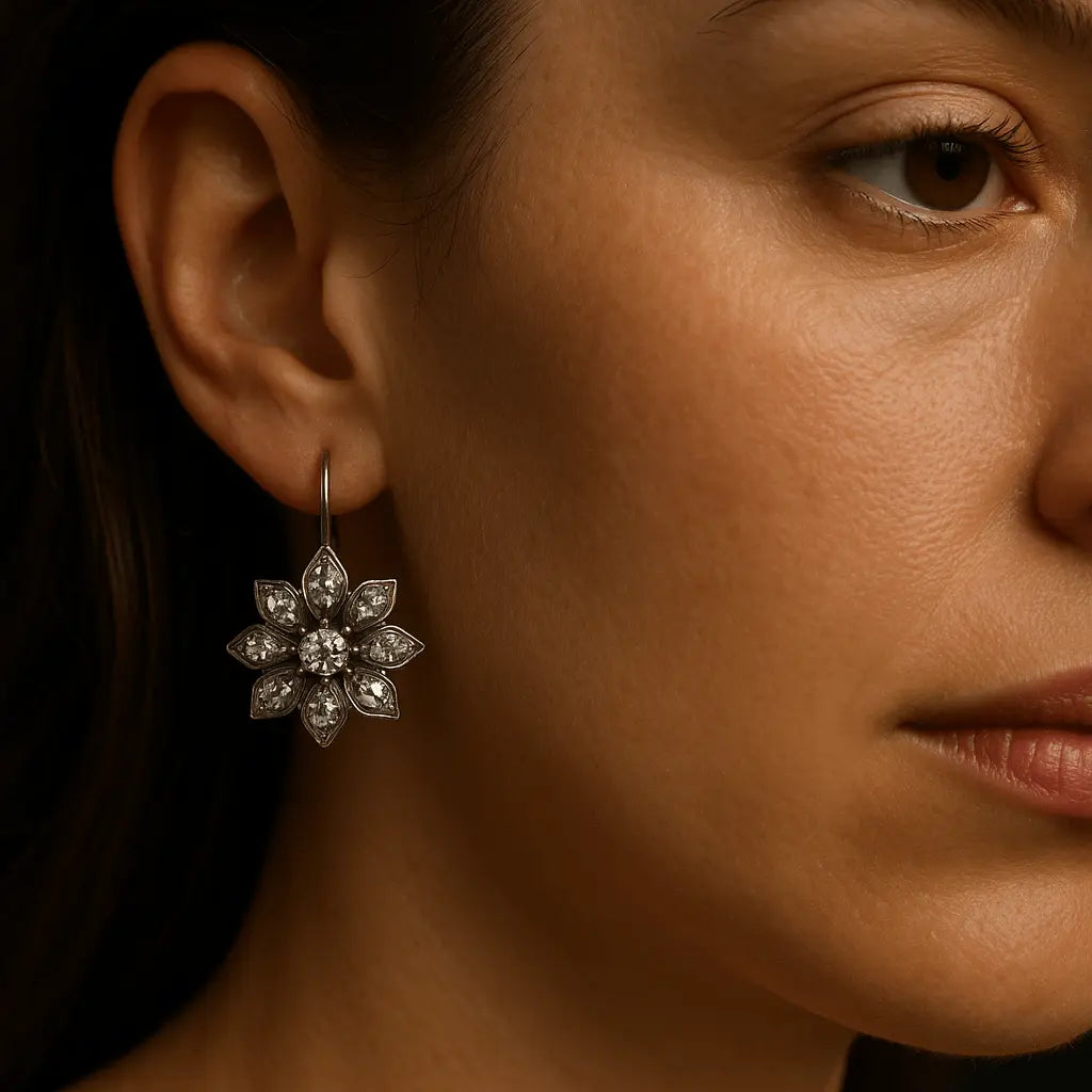 These vintage-inspired flower earrings combine a classic design with a dazzling presence. Each faceted petal gently catches the light, giving a subtle glow that flatters effortlessly. Their symmetrical floral silhouette and antique-jewellery aesthetic make them ideal for special occasions or for elevating any outfit with a refined touch. Designed for women who value artistry in the details and timeless elegance.