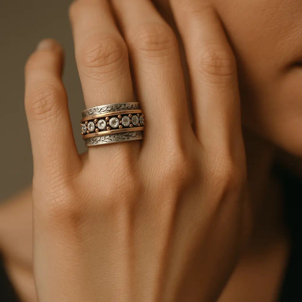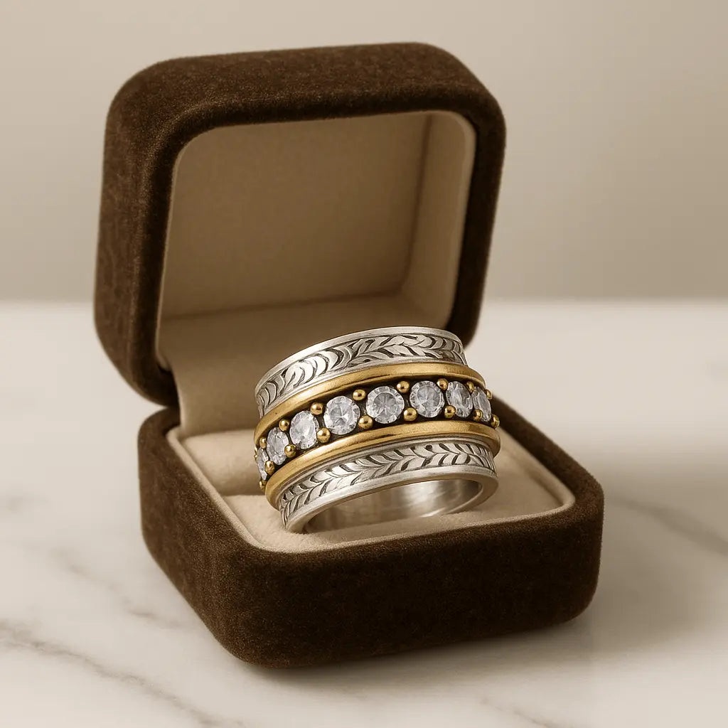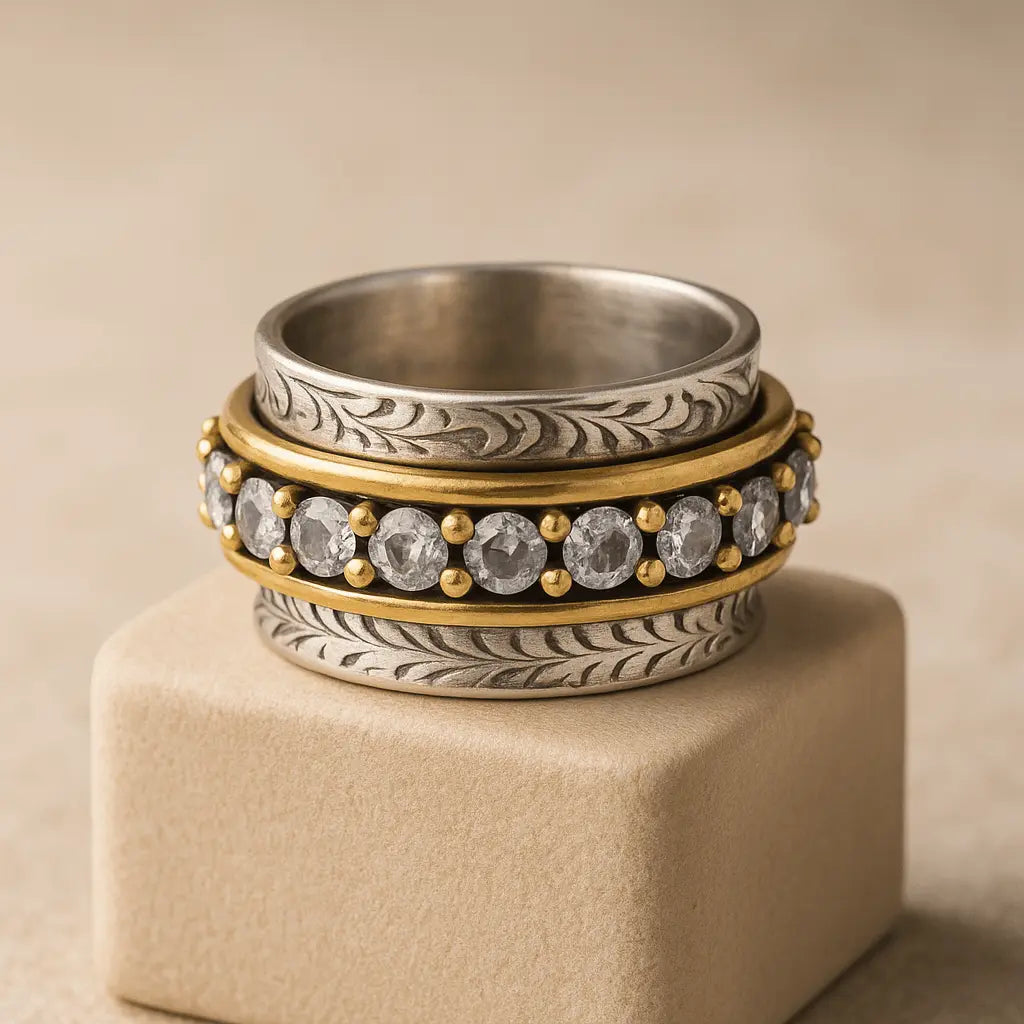 This two-tone vintage ring blends a classic design with sophisticated details that catch the light with every movement. The harmony of gold and silver tones with cubic zirconia creates a timeless piece—ideal for those who value elegance with character. Perfect worn solo or stacked with other jewellery, this ring turns any outfit into a statement of refined style.
