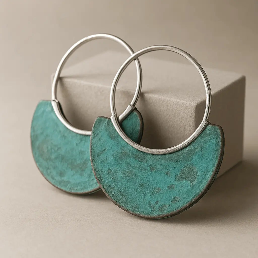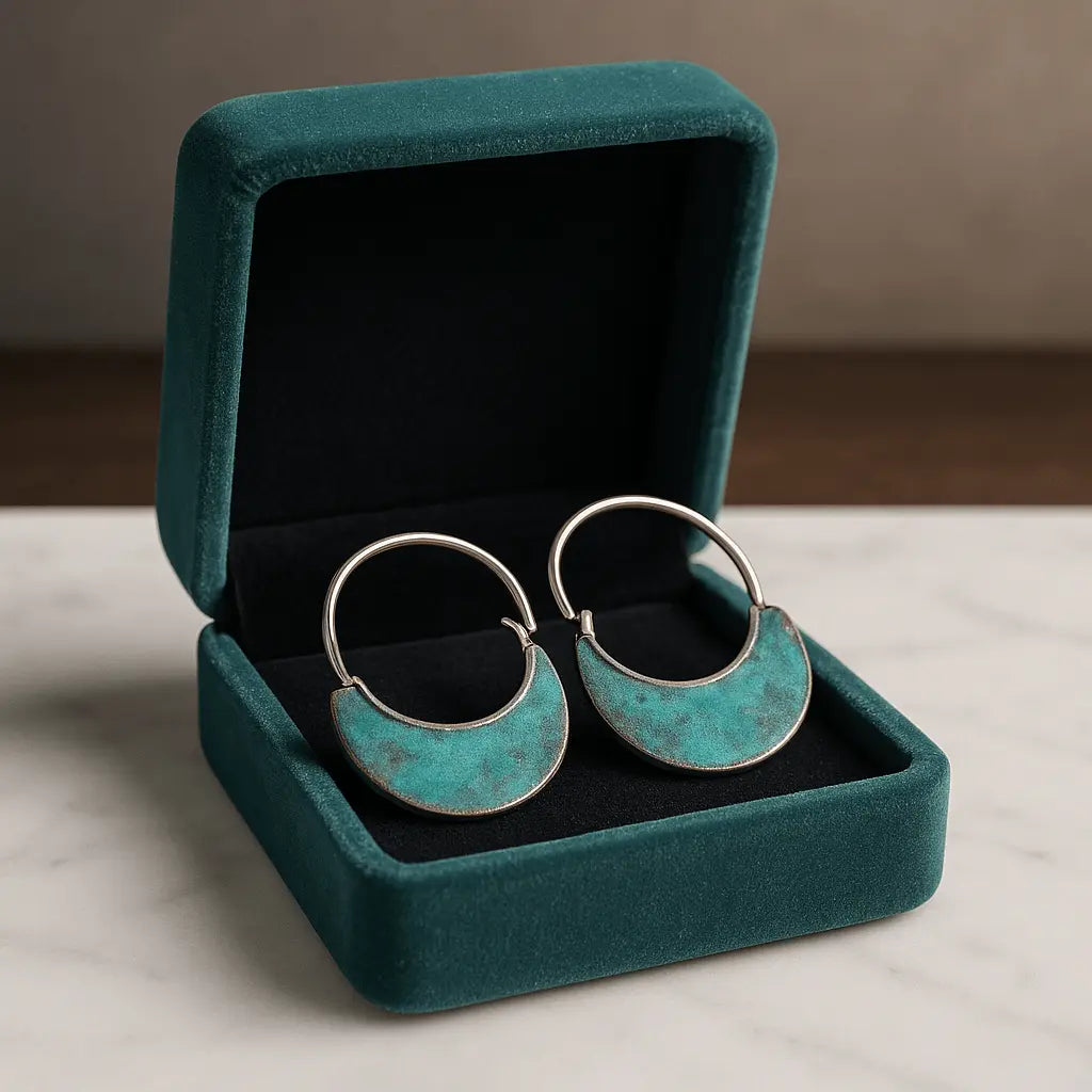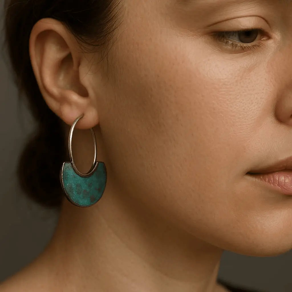 This earring is a statement piece on its own. Its curved design with an antiqued finish showcases a central turquoise stone that adds a vibrant, distinctive touch. Created for women who appreciate pieces with history and character, it’s the ideal accessory to elevate any outfit with ease. Its structured shape, combined with the metal’s rugged texture, strikes the perfect balance between the classic and the bold.
